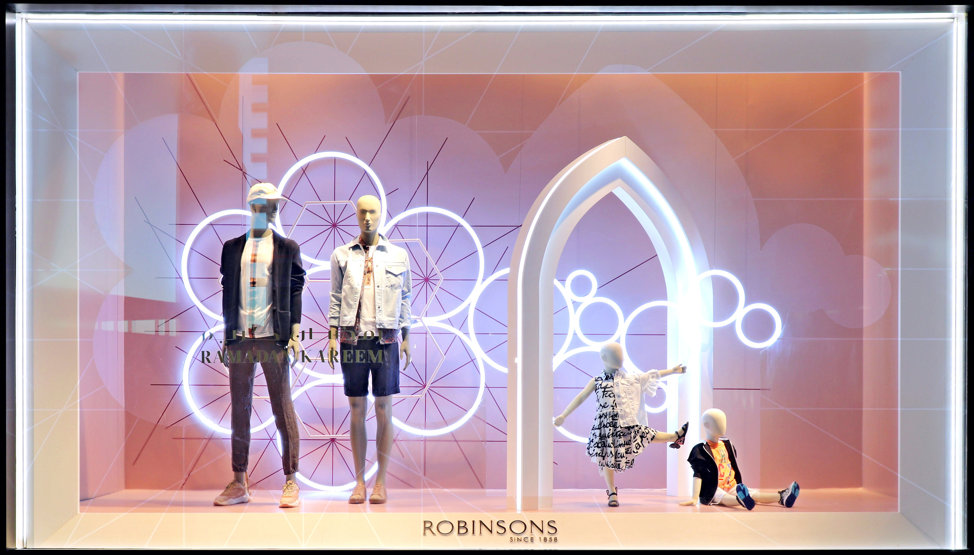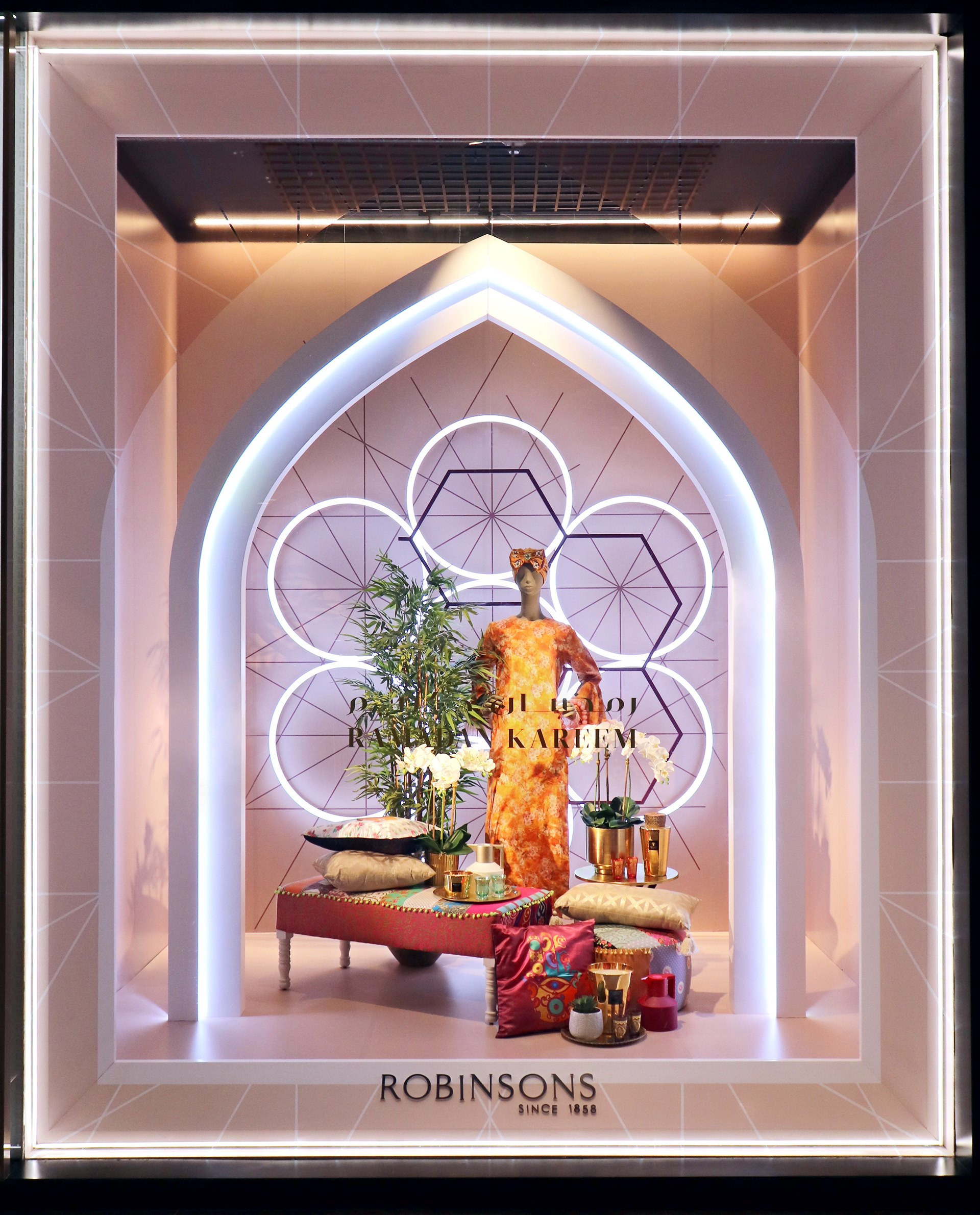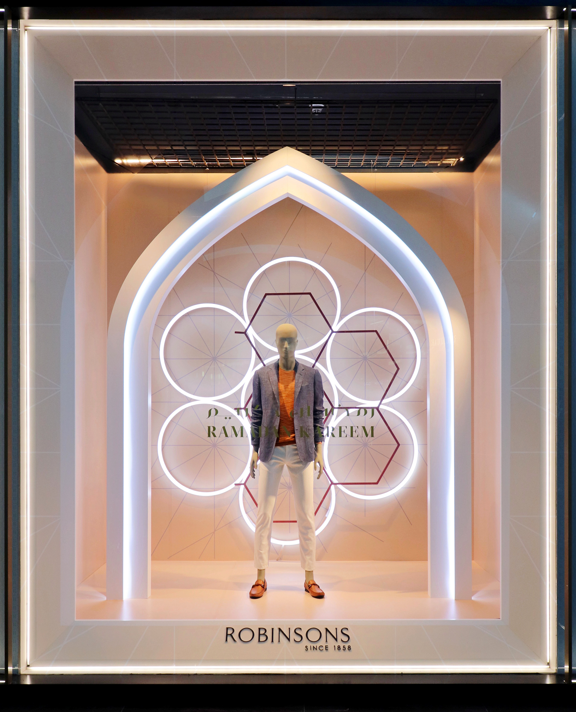 Inspired by Robinsons Ramadan Collections & contemporary Arabic architecture we have designed a series of elegant windows & instore pop ups that both reflect the brand and hero the product.