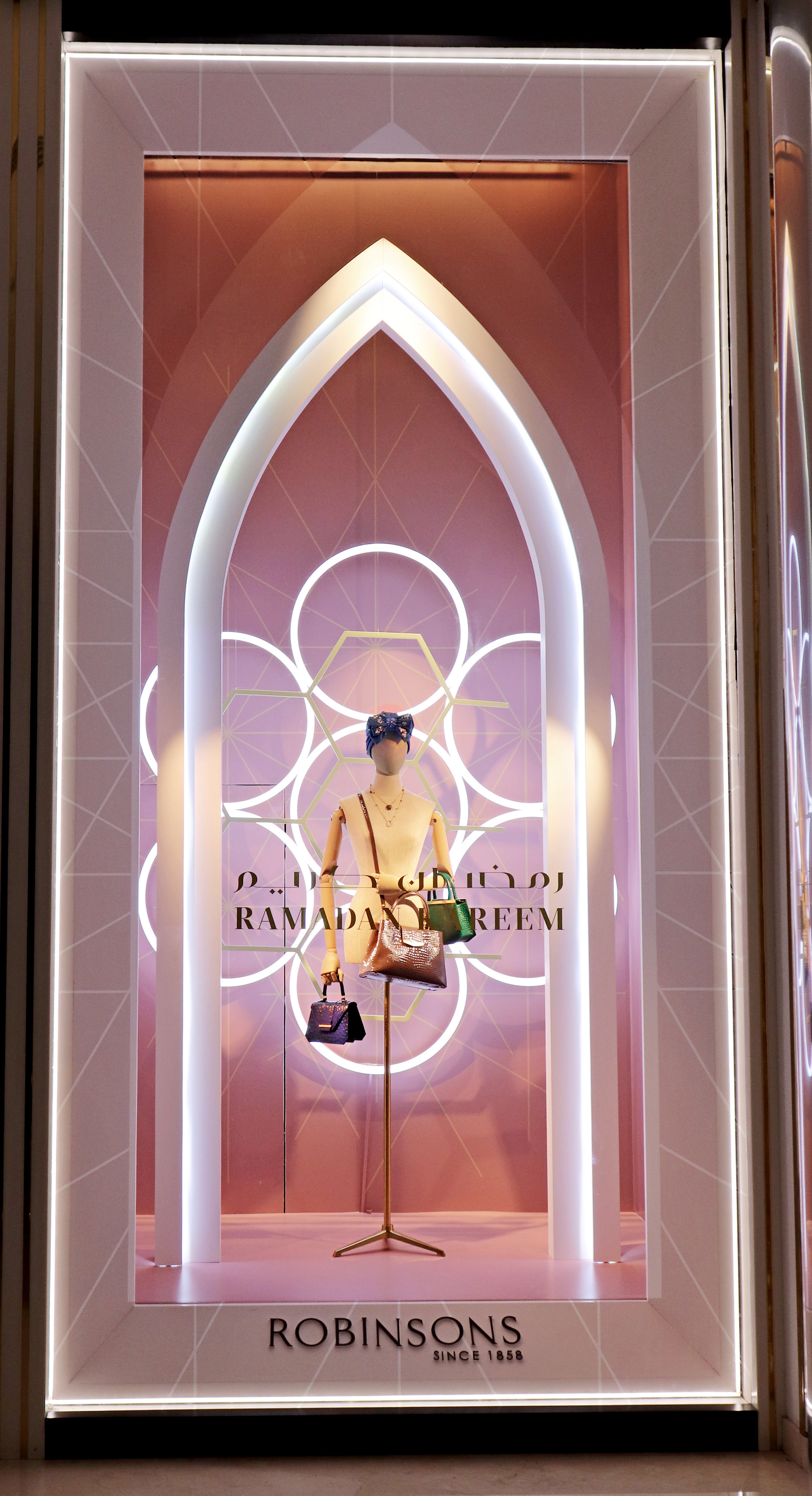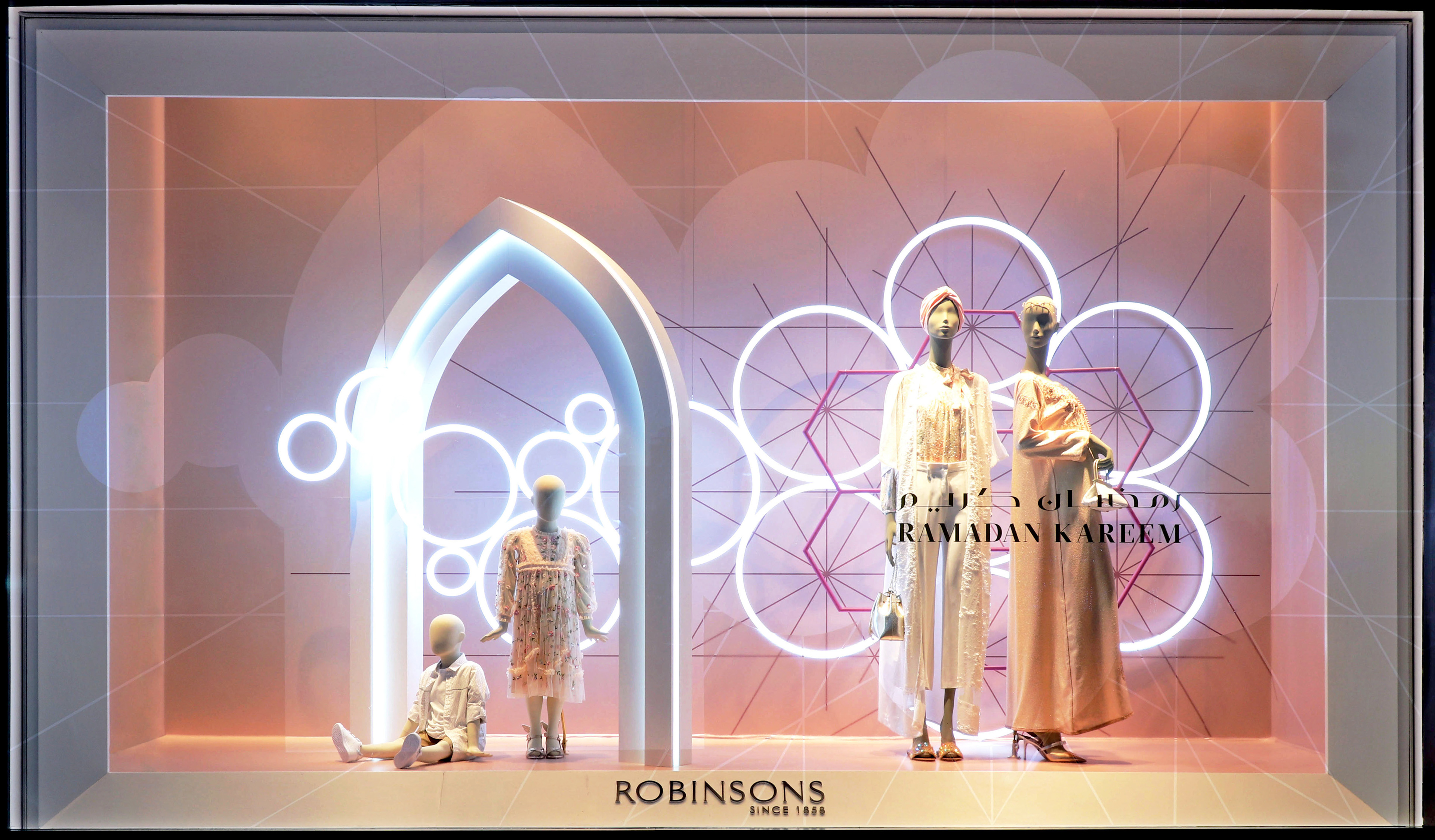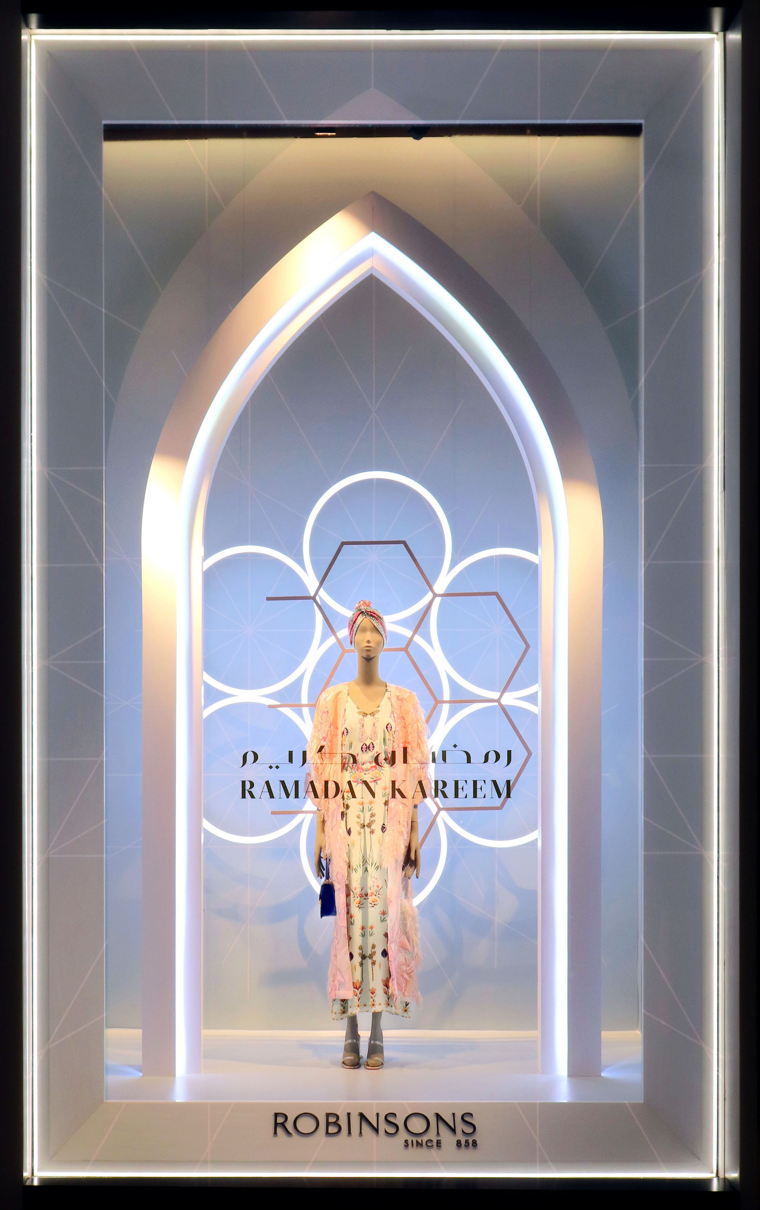 Inspired by Robinsons Ramadan Collections & contemporary Arabic architecture we have designed a series of elegant windows & instore pop ups that both reflect the brand and hero the product.